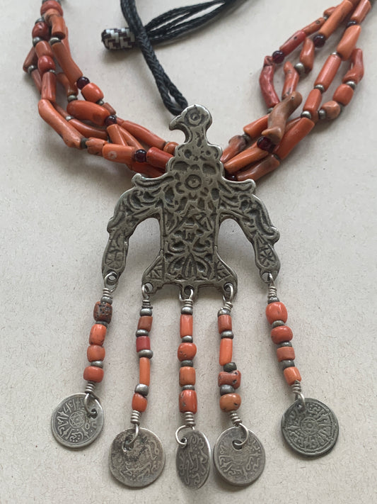 Vintage Eagle and Antique Coral Necklace - Moroccan Neckpiece