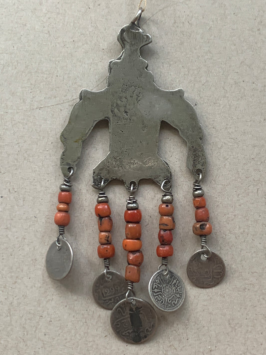 Moroccan Vintage Eagle Pendant with Coral and Coins